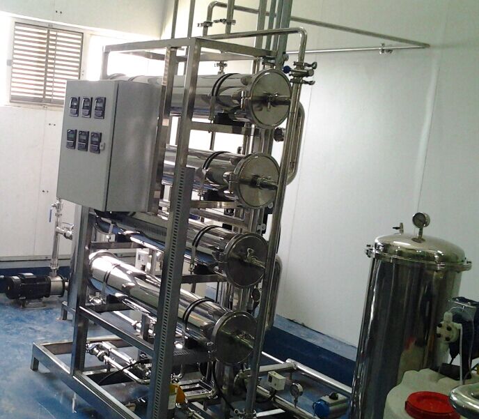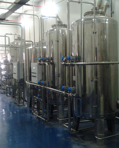 3.原水箱→原水增壓泵→多介質過濾器→活性炭過濾器→軟水器→保安過濾器→一級反滲透機→中間水箱→中間水泵→EDI系統→純化水箱→殺菌系統→純化水輸送泵→紫外線殺菌器→微孔過濾器→用水點
