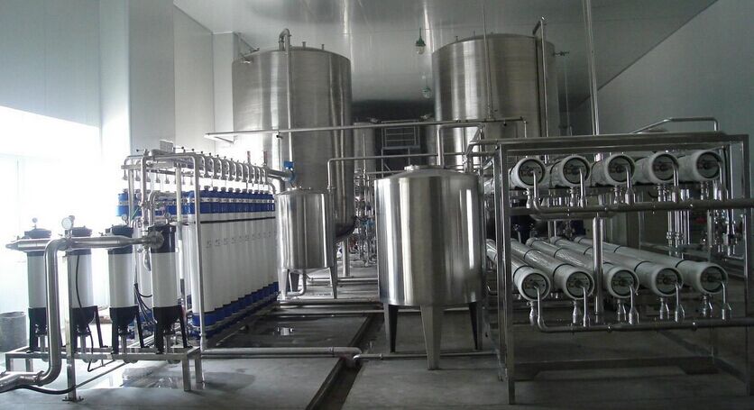 原水-原水加壓泵-多介質(zhì)過濾器-活性炭過濾器-軟水器(或阻垢加藥裝置)-精密過濾器-第一級反滲透 -PH調(diào)節(jié)-中間水箱(可選)-第二級反滲透(反滲透膜表面帶正電荷)-純化水箱-純水泵-紫外線殺菌器- 微孔過濾器-用水點